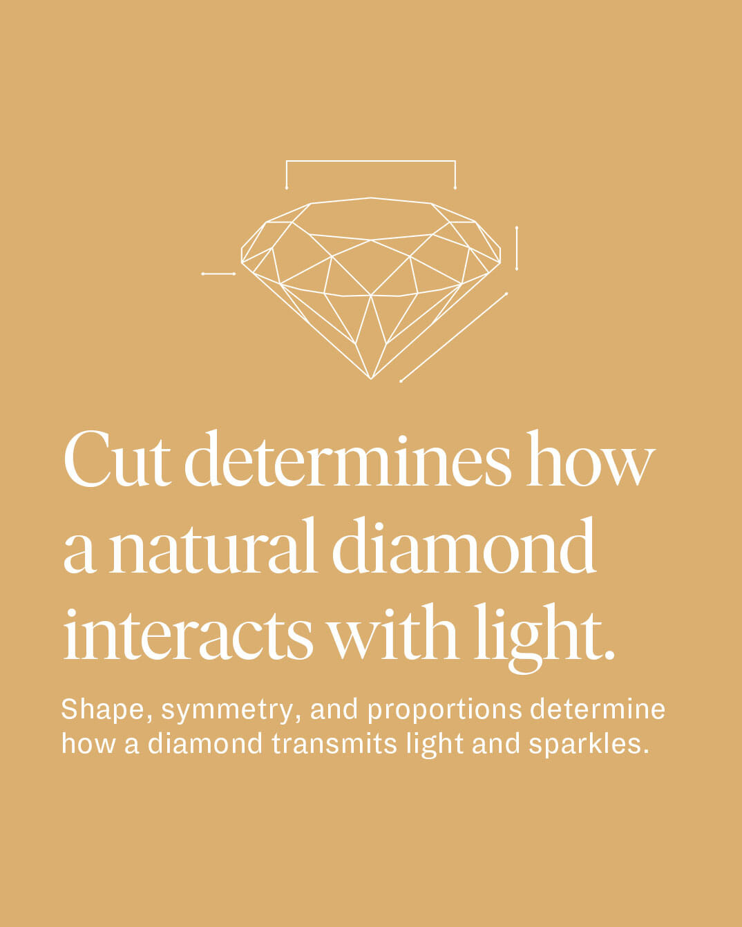 The cut of a natural diamond determines how it interacts with light. The Cut Grading System assesses diamond appearance, including its brightness, fire, and scintillation, which make up the way a diamond reflects light, dispersing it into color, and sparkles.