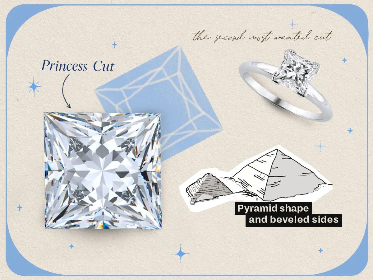 The Princess cut, a.k.a. square modified brilliant in diamond-speak, is the second most-wanted cut. Its pyramid shape and bevelled sides give it incredible shine and reflection. Princess cuts are beloved because they offer the best of both worlds—they have clean and modern lines with pointed, square corners, but also the fire to rival a round brilliant. This cut uses up to 80% of the rough stone, as opposed to only 40-50% in other cuts, making it an option which packs in flash while saving cash.