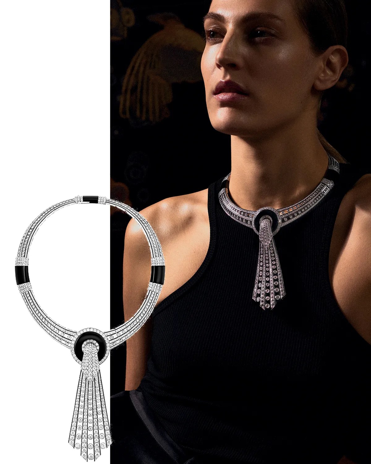 The culmination of Boucheron Creative Director Claire Choisne’s exploration of the duality of gender expressed in the Roaring Twenties, when women asserted their femininity with masculine clothing and short hair, the striking diamond jewelry focuses on pure lines and the contrast of black, white and touches of color.