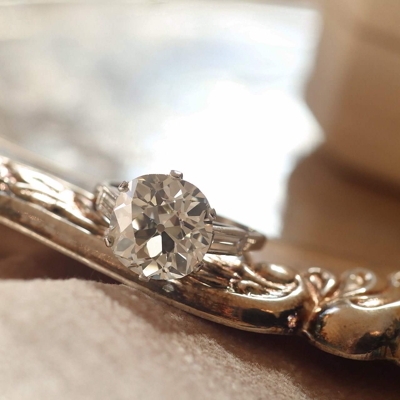 Pairing them with a round diamond shape, like a round brilliant or an Old European Cut, is an easy combination, since they enhance the stone’s roundness and fade into the background to let the diamond be the star of the show. From a practical standpoint, round prongs tend to be less likely to get snagged on clothes.