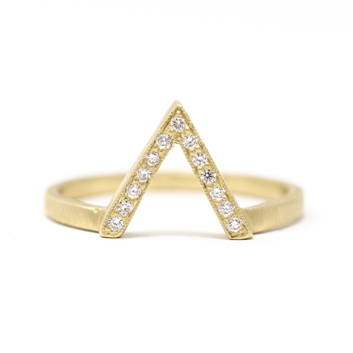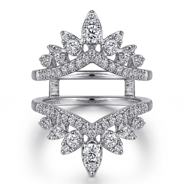 A chevron ring jacket features a V-shaped design with the pointed tip facing outward from the center stone, which creates a sleek, modern effect and can add contrast to round and oval diamond cuts.