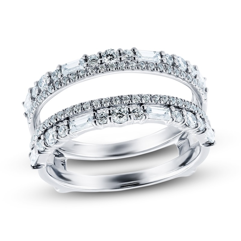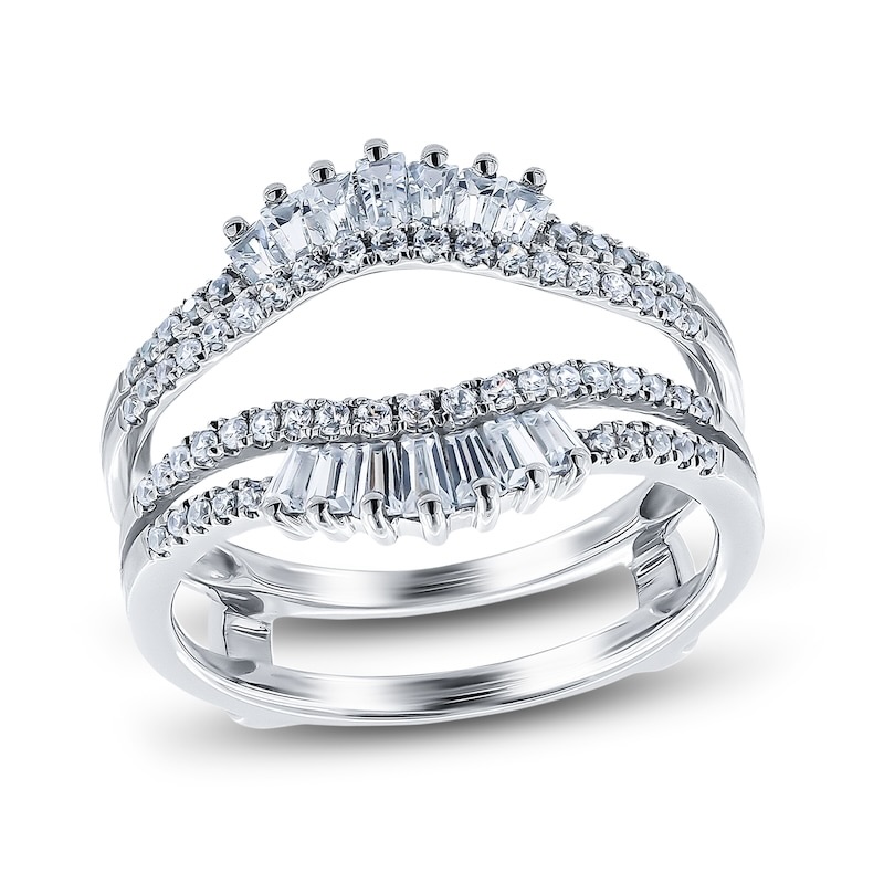In terms of design, a ring enhancer is usually made of a single piece of gold or platinum with two bands that connect at the base. The open space in the middle of the bands is meant to frame the main ring. Since the fit needs to be precise, many shoppers opt for custom or semi-custom options.