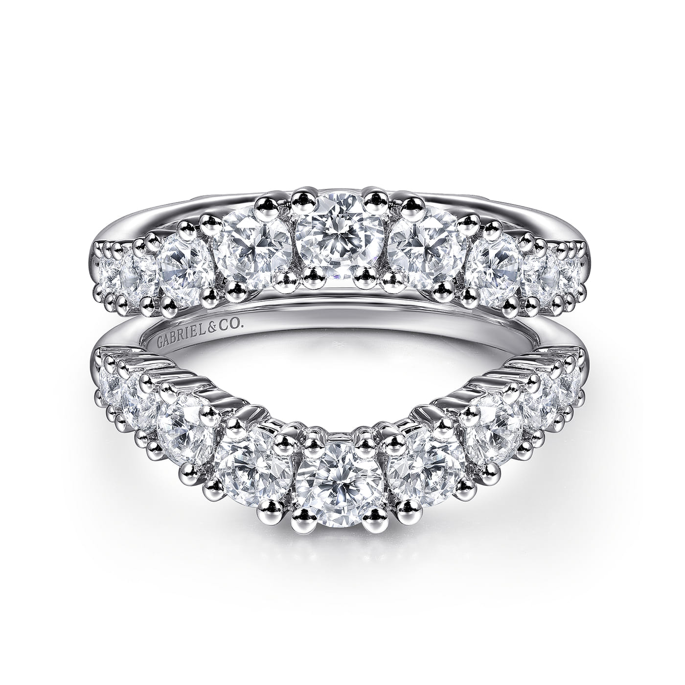 They can be paired with all sorts of diamond shapes and often feature diamond accents. There are different styles, from contoured silhouettes and halos that follow the shape of a center stone to more architectural designs. Some ring enhancers sit flush with an engagement ring, while others use negative space to create visual appeal.
