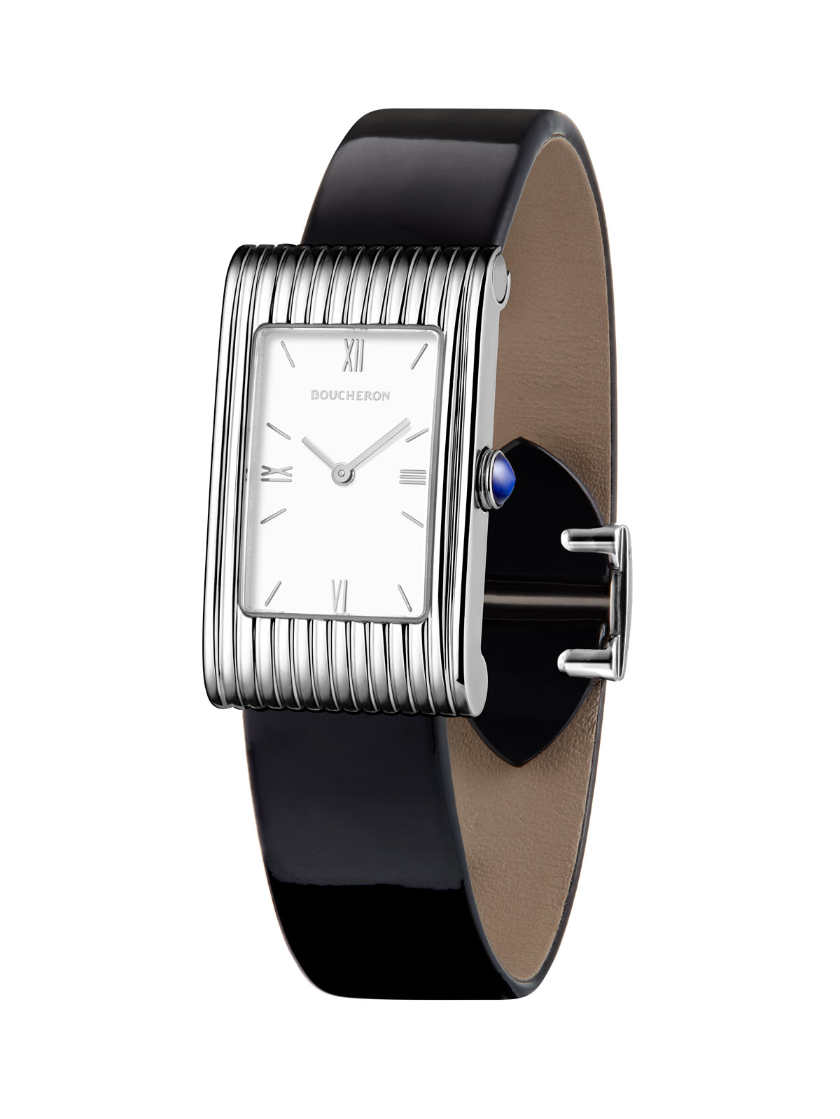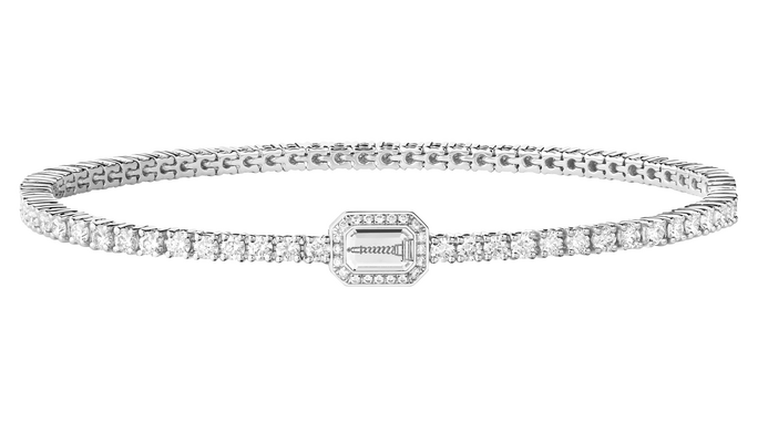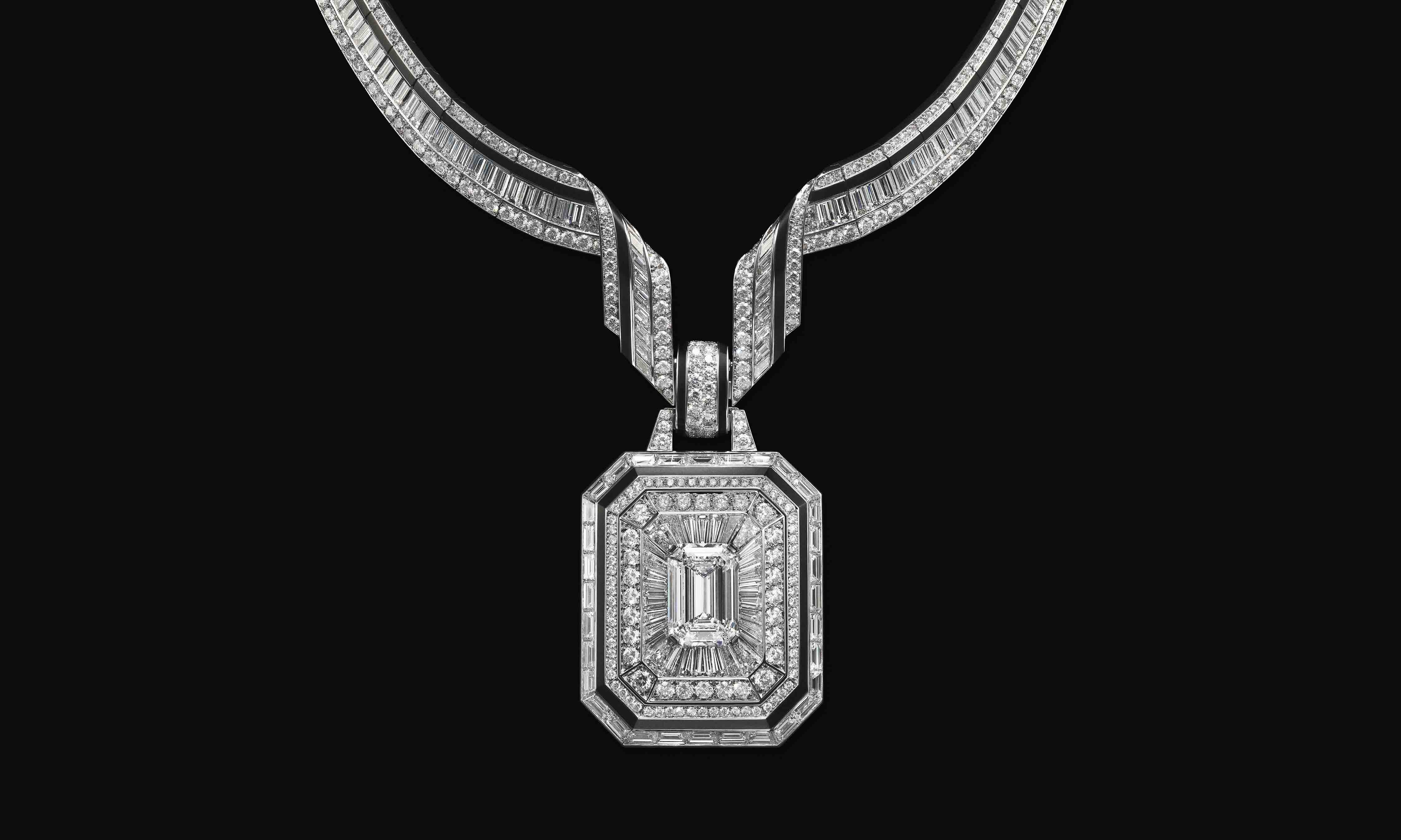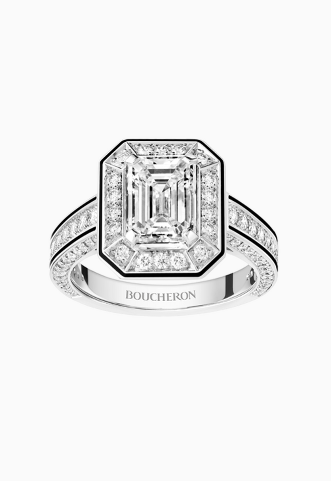 Léa Drucker portait le bracelet Art Déco, collection Privée Boucheron, de 1926, en or, platine et diamants et les dormeuses Vendôme Liseré, serties de diamants taille émeraude, pavées de diamants ronds, sur or blanc, avec laque noire, ainsi que la bague Vendôme Liseré, sertie d’un diamant taille émeraude de 2ct, pavée de diamants ronds, sur or blanc, avec laque noire. Crédit Boucheron.