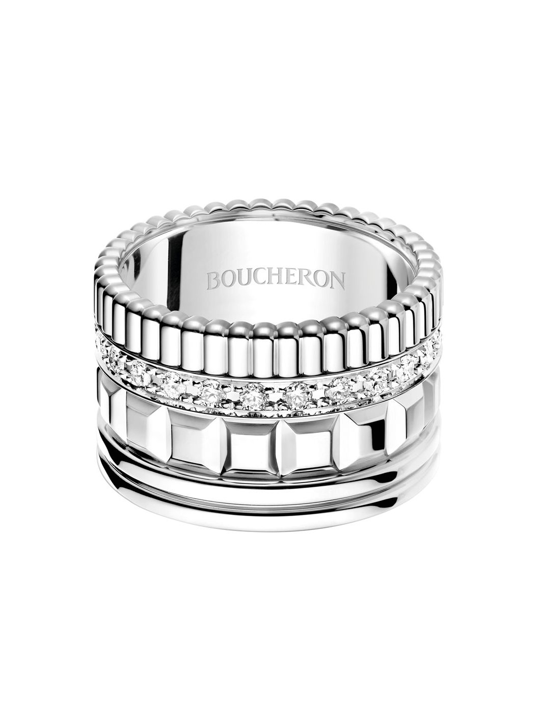 Xavier Dolan portait une paire de clips, collection Privée Boucheron, de 1960, en or blanc, platine et diamants, et collier Rivière Vendôme, pavé de diamants, sur or blanc, des clips d’oreilles unitaires Quatre Radiant Edition, pavés de diamants, sur or blanc, l’alliance Quatre Red Edition, pavée de diamants sur or blanc et or rose, avec céramique rouge, l’alliance Quatre Double White Edition, avec céramique blanche, sur or blanc, l’alliance Quatre Black Edition, avec PVD noir, sur or blanc, la bague Quatre Radiant Edition petit modèle, pavée de diamants, sur or blanc, ainsi que la bague Quatre Black Edition XS, pavée de diamants sur or blanc, avec PVD noir. Crédit Boucheron