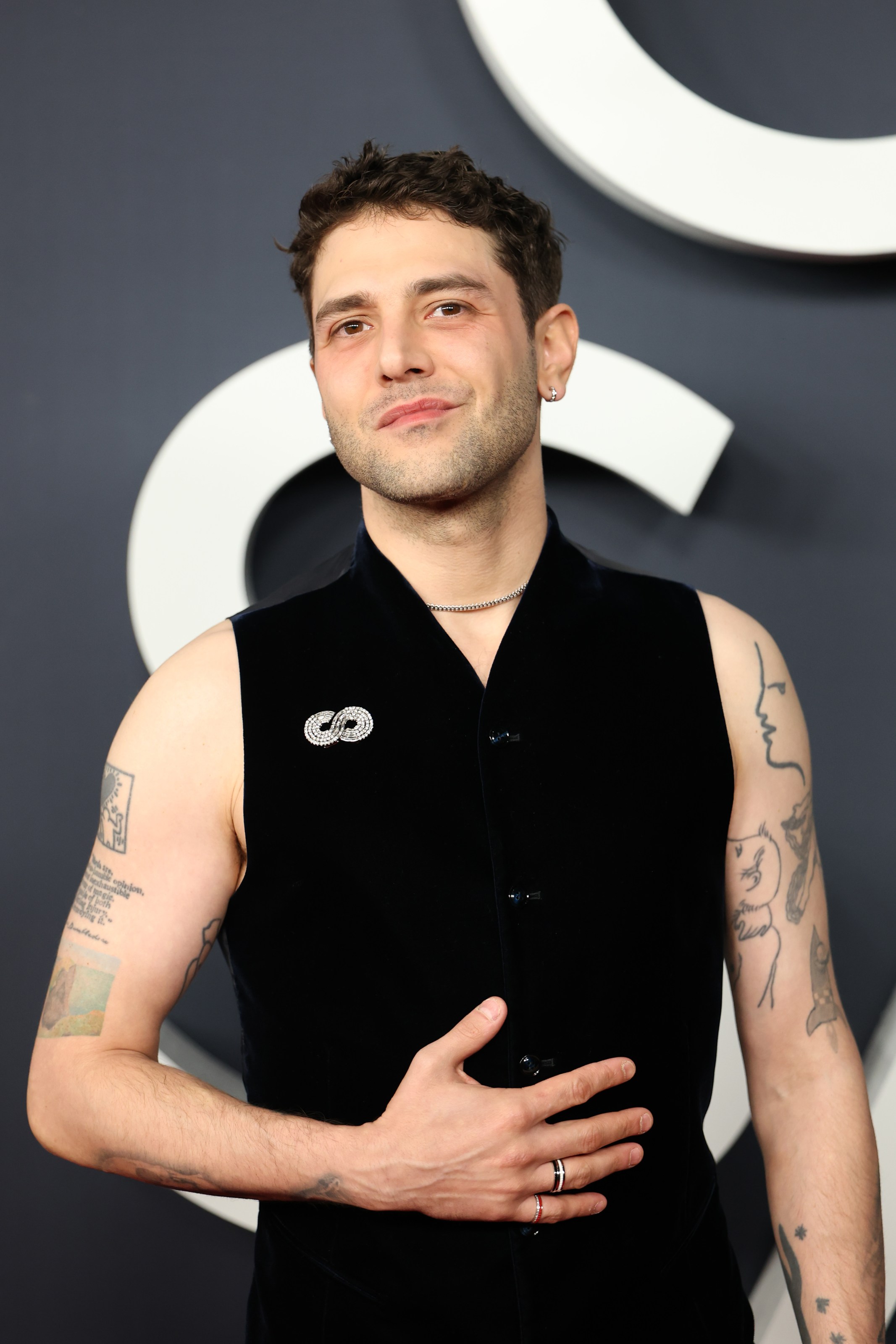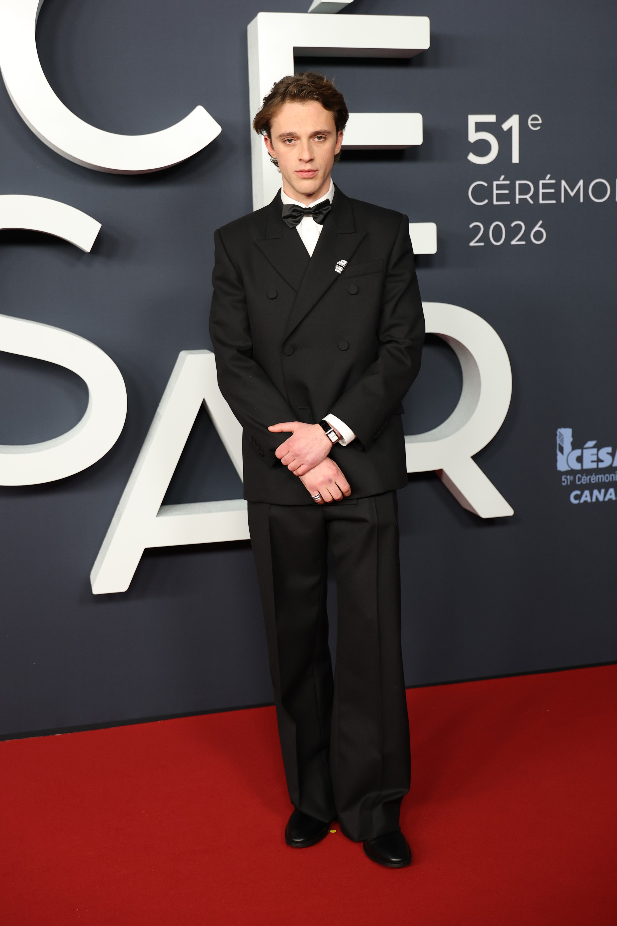Benjamin Voisin avait choisi de porter la montre Reflet medium, en acier, avec bracelet en cuir noir, les puces d’oreilles Quatre Radiant Edition en broche, entièrement pavées de diamants ronds, taille baguette et taille princesse, sur or blanc, ainsi que la bague Quatre Radiant Edition grand modèle, pavée de diamants, sur or blanc. Crédit Boucheron