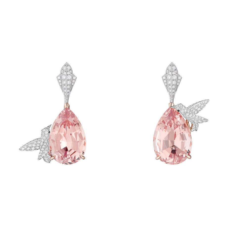 Suzanne Lindon était parée des dormeuses Hopi le Colibri, serties de deux morganites taille poire de 24.34 carats, pavées de diamants, sur or blanc et or rose, avec laque noire, de la bague Hopi le Colibri, sertie d’une morganite taille poire de 12.75ct, pavée de diamants sur or blanc et or rose, avec laque noire, ainsi que du bracelet Rivière Vendôme, pavé de diamants sur or blanc. Crédit Boucheron.