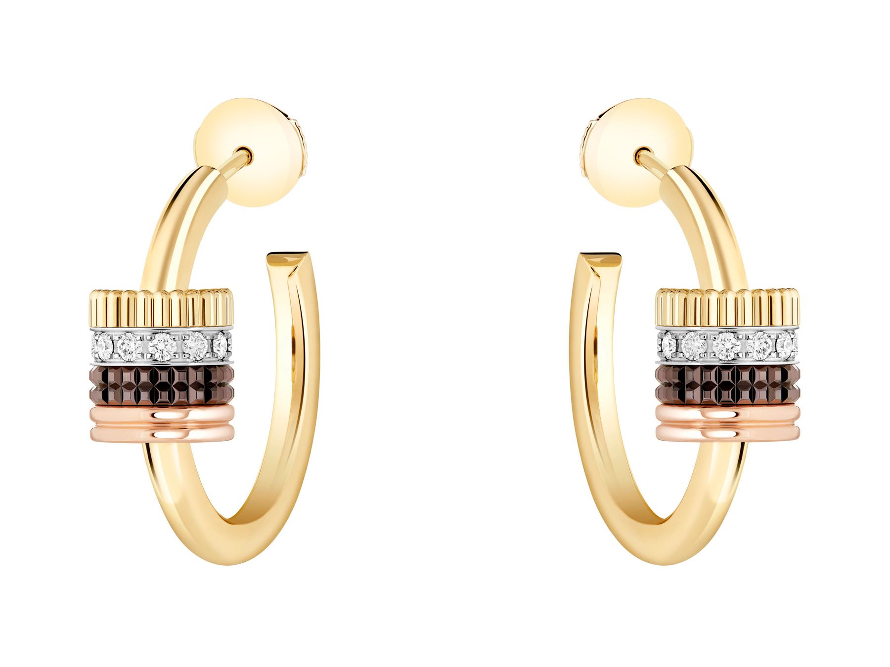 Pauline Loquès portait les créoles Quatre Classique, en or jaune, avec motif en or jaune, or blanc et or rose, pavé de diamants, avec PVD marron. Crédit Boucheron.