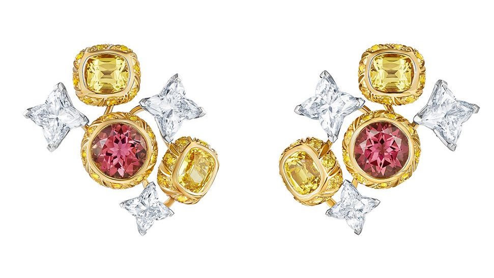 Marina Foïs, en total look Louis Vuitton, portait les boucles d’oreilles Joy en tourmaline, saphirs jaunes et diamants de la collection Louis Vuitton Haute Joaillerie. Crédit Louis Vuitton Haute Joaillerie