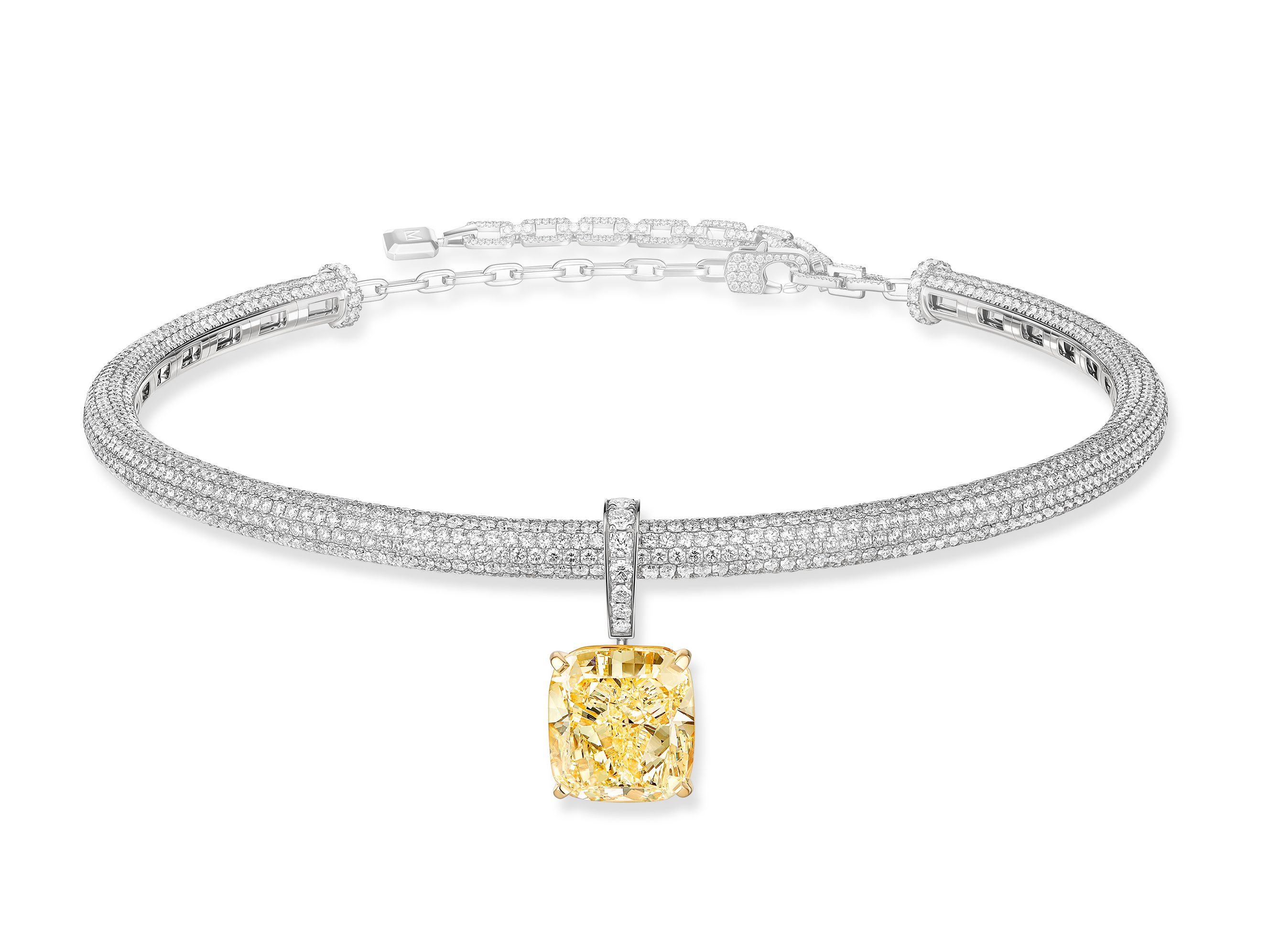 Isabelle Adjani portait le collier Divine Enigma, orné d’un diamant jaune taille coussin de 18 carats, associé à la bague Concorde, sertie d’un diamant poire de 8 carats, et à la bague Mille Feux de Messika. Crédits Messika.