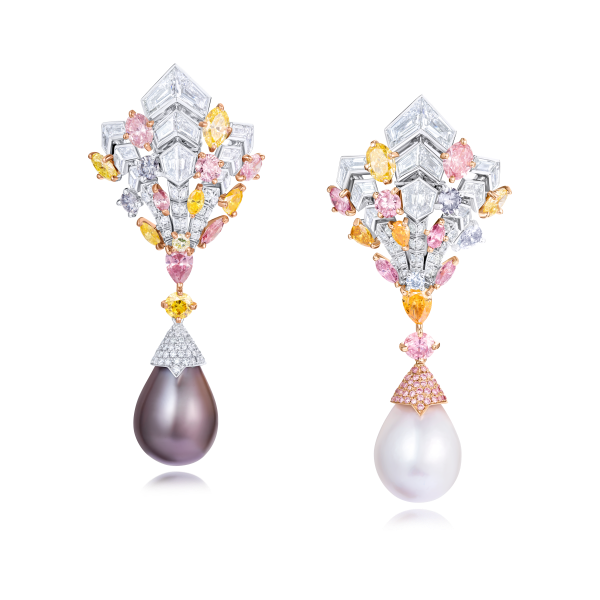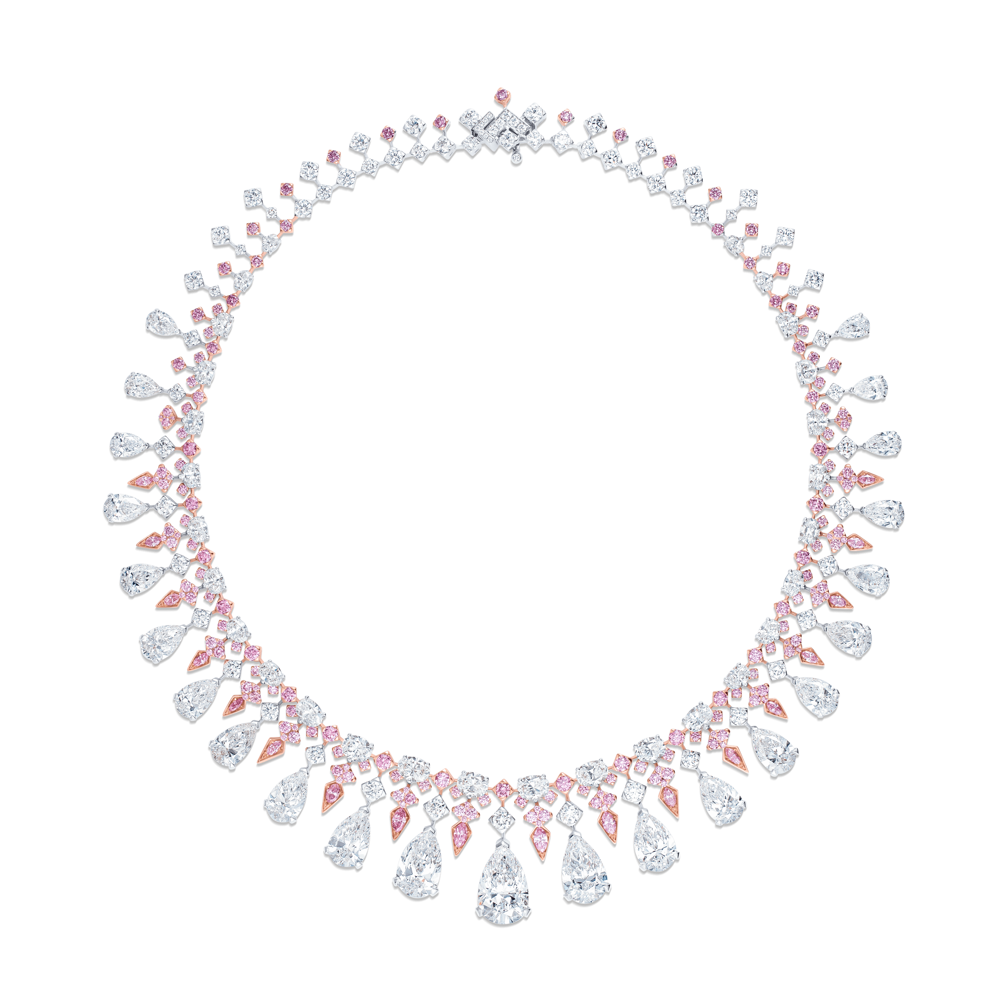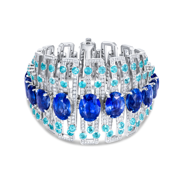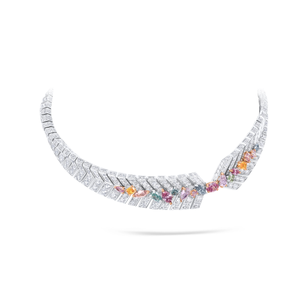 Sous la direction créative de Jeremy Morris, la palette s’est élargie sans perdre sa cohérence. Les diamants roses, signature de la maison, restent centraux, notamment dans leurs nuances Purplish Pink, choisies pour leur intensité chromatique. Ils dialoguent avec des diamants blancs dans des compositions structurées, comme la parure Harmonia ou le bracelet Prisma, où la géométrie précise renforce la lisibilité des contrastes.