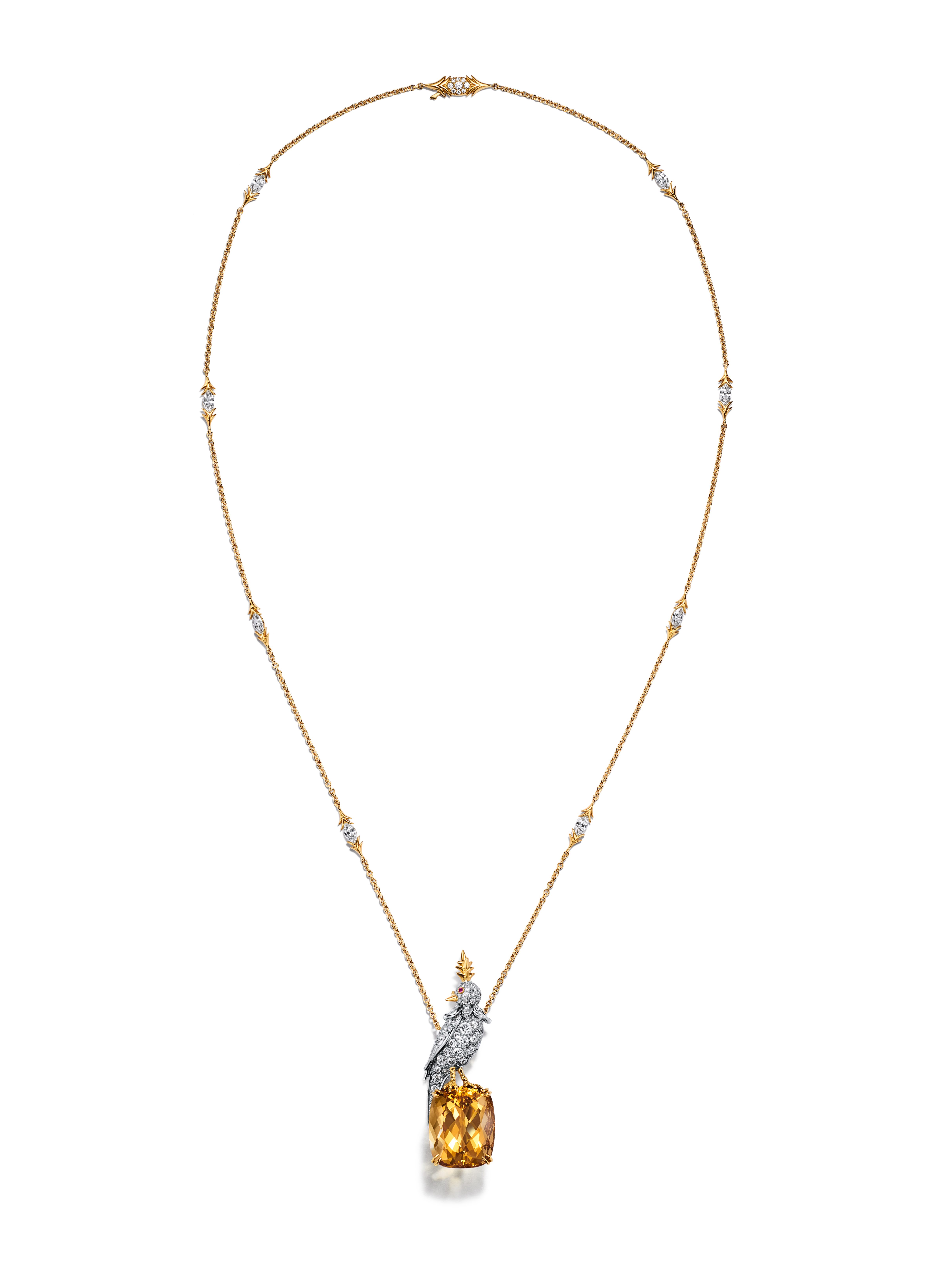 Elle portait le pendentif Bird on a Rock en or jaune et platine avec une citrine de 15,95 carats, des diamants et des saphirs roses, ainsi que la bague Elsa Peretti de couleur Fancy en or jaune et avec une citrine, de la collection Bird on rock de Tiffany& Co. Crédit Tiffany &Co.