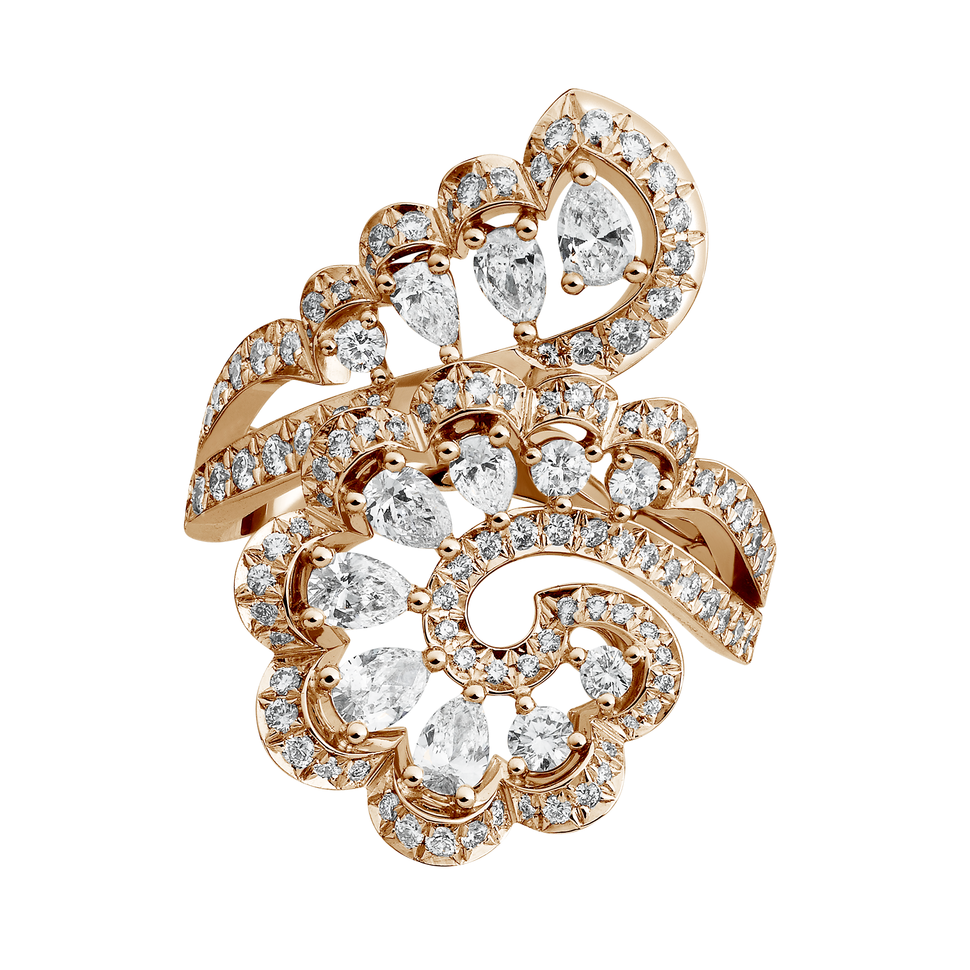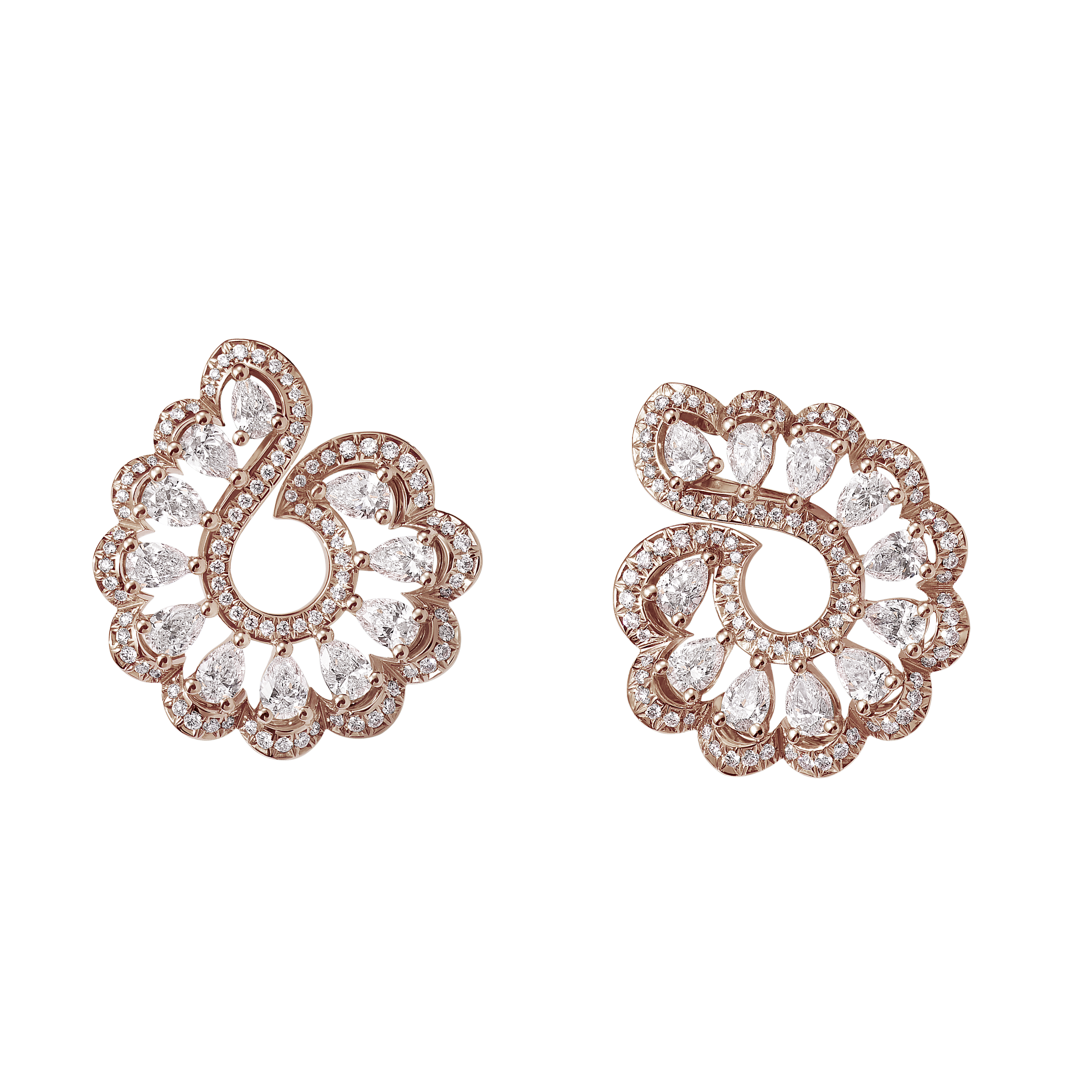 Ester Expósito a choisi des boucles d’oreilles en or rose 18 carats serties de 1,72 carat de diamants taille poire et de 0,45 carat de diamants, ainsi qu’une bague en or rose 18 carats sertie de 0,62 carat de diamants taille poire et de 0,70 carat de diamants, l’ensemble issu de la collection Precious Lace de Chopard. Crédit Chopard.