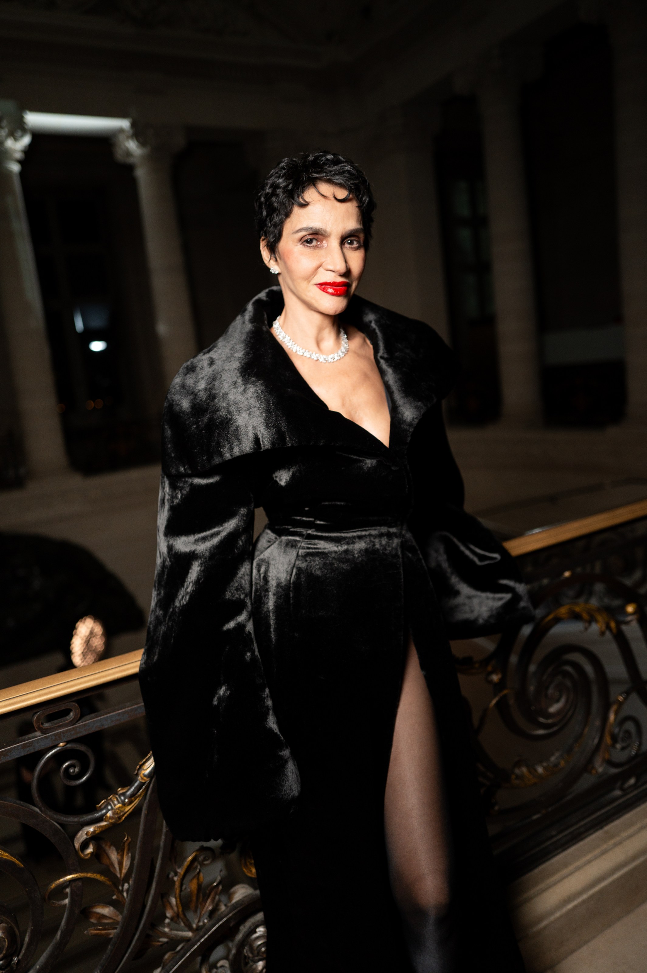 Farida Khelfa sublime avec des bijoux Chopard. Elle portait un collier en or blanc 18 carats de la collection Haute Joaillerie, serti de 9,21 carats de diamants taille Asscher, de 55,90 carats de diamants ovales et de 4,74 carats de diamants taille brillant, ainsi que des boucles d’oreilles en or blanc 18 carats de la collection L’Heure du Diamant, serties de 1,33 carat de diamants baguette et de 0,48 carat de diamants taille brillant. Crédits Chopard et Astra Marina/BFA.com