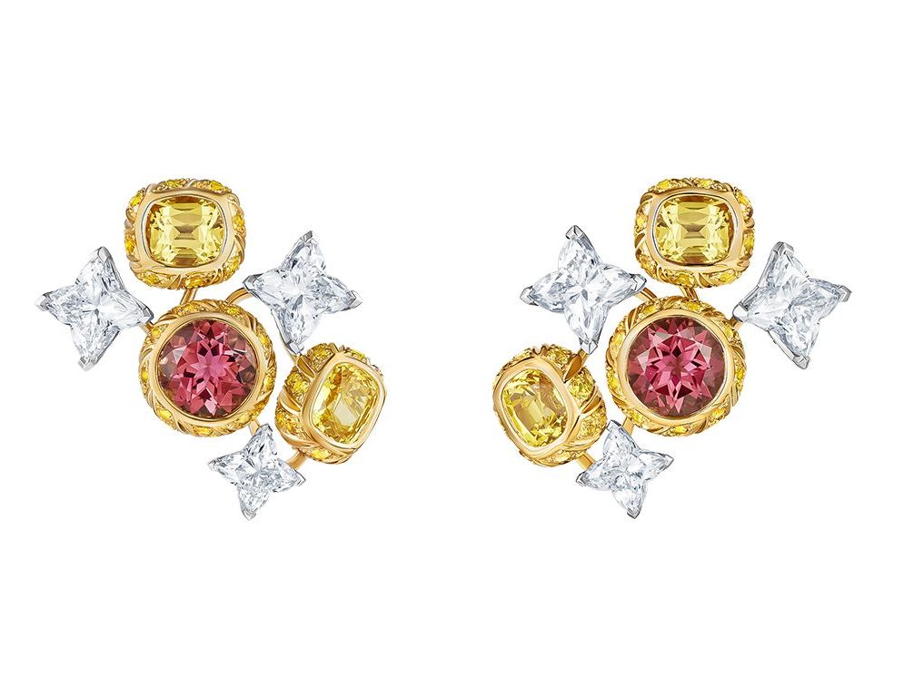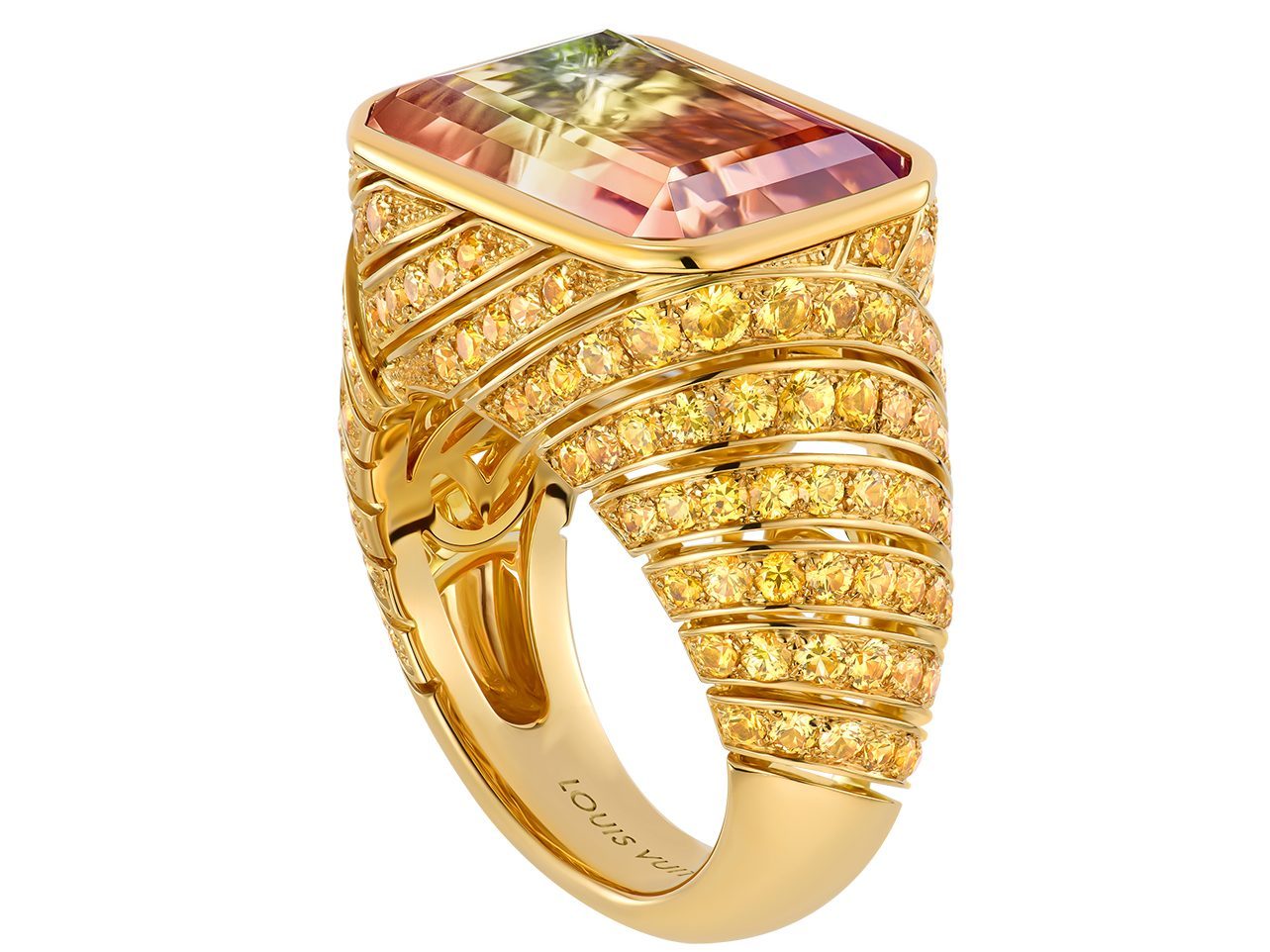 Marina Foïs portait les boucles d’oreilles Joy en tourmaline, saphirs jaunes et diamants et la bague Joy dotée d’une exceptionnelle tourmaline bicolore de 12-64 carats de la collection Louis Vuitton Haute Joaillerie. Crédit Louis Vuitton Haute Joaillerie.