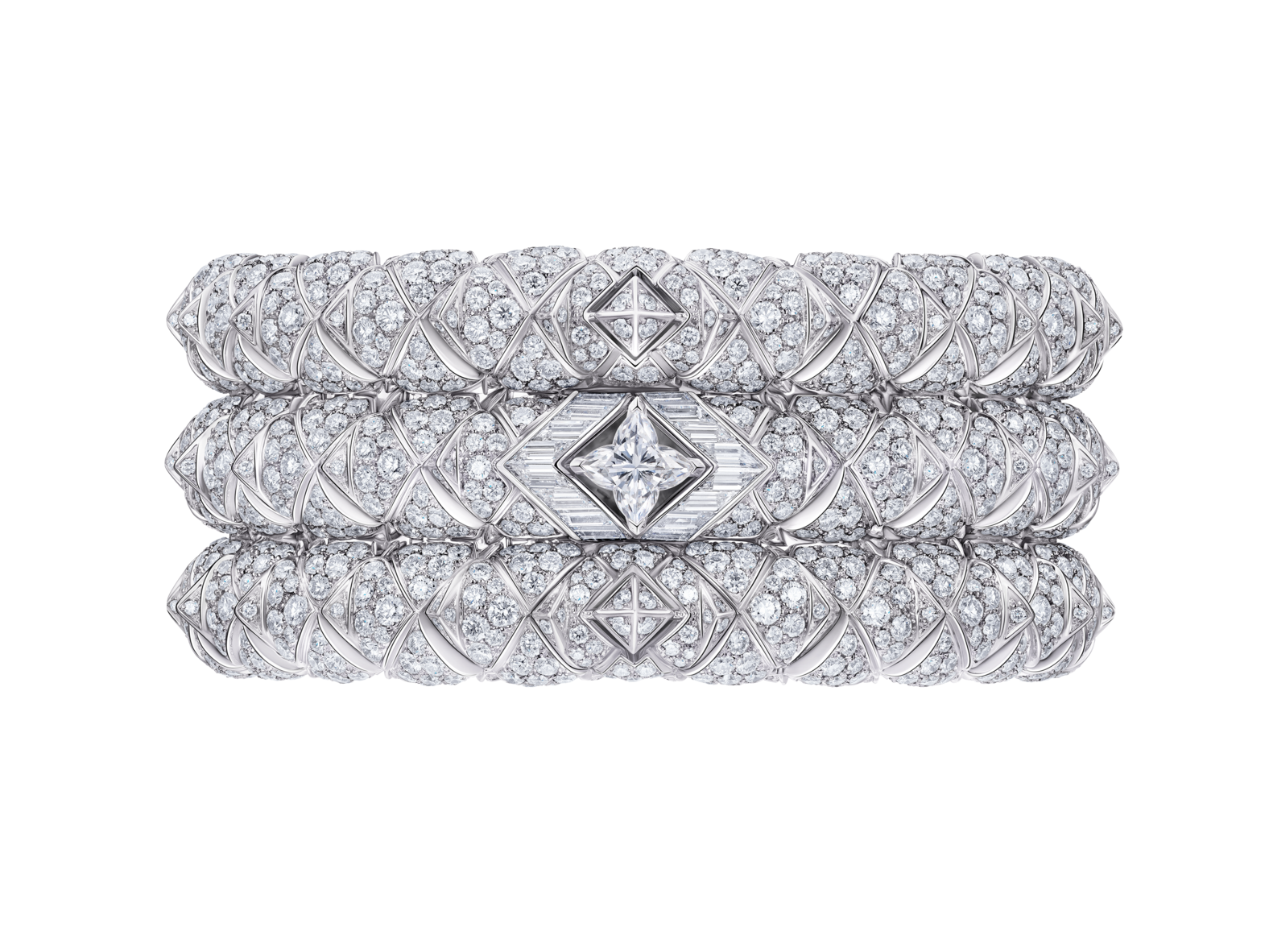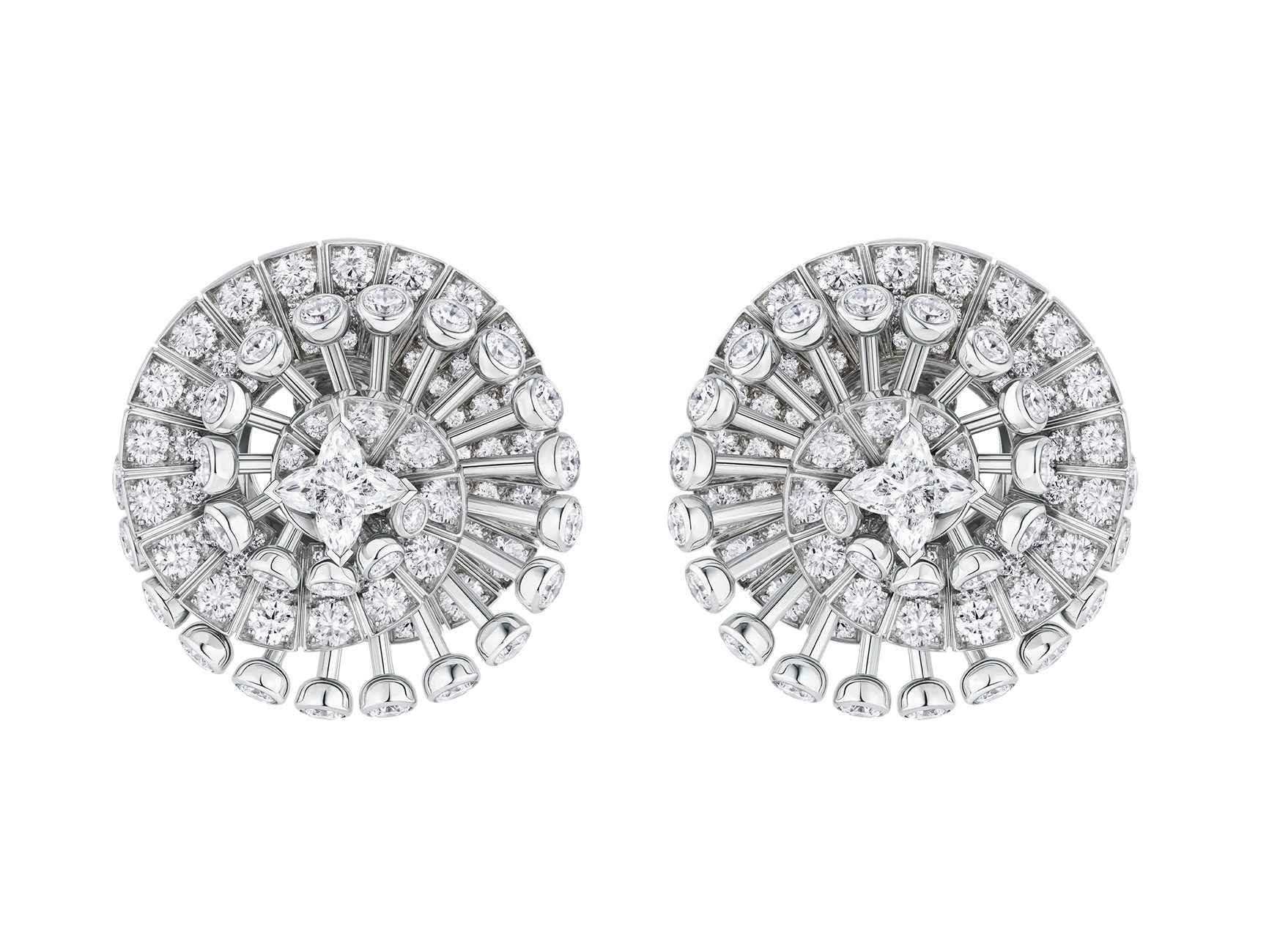 Stacy Martin portait les boucles d’oreilles Myriad en or blanc, deux diamants tailles LV Monogram star et diamants de la Collection Deep Time, et le bracelet Perception en or blanc, un diamant taille LV Monogram Star de 1,23 carat et diamants de la collection Awakened Minds. Crédit Louis Vuitton Haute Joaillerie.