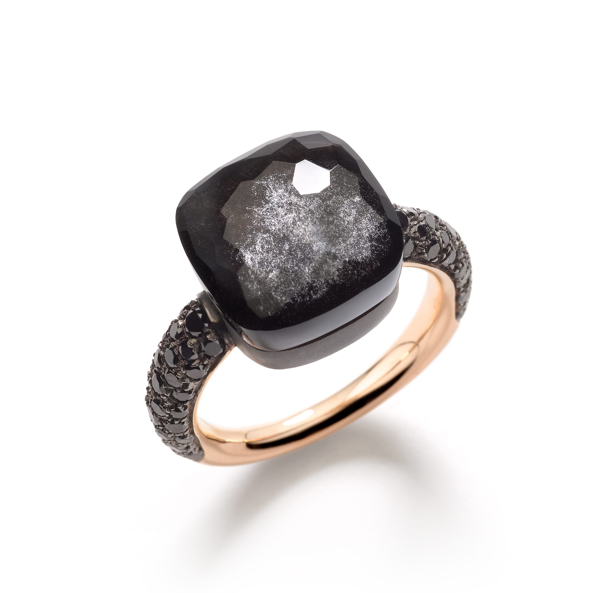 Philippine Leroy Beaulieu portait les Bagues Pomellato, collection Nudo, en or rose avec obsidienne et diamants noirs traités, portées en accumulation, avec des pierres de tailles différentes, ainsi que les boucles d’oreilles Pomellato, collection Scala di Luce, en or rose serties de diamants taille fantaisie. Crédit Pomellato.
