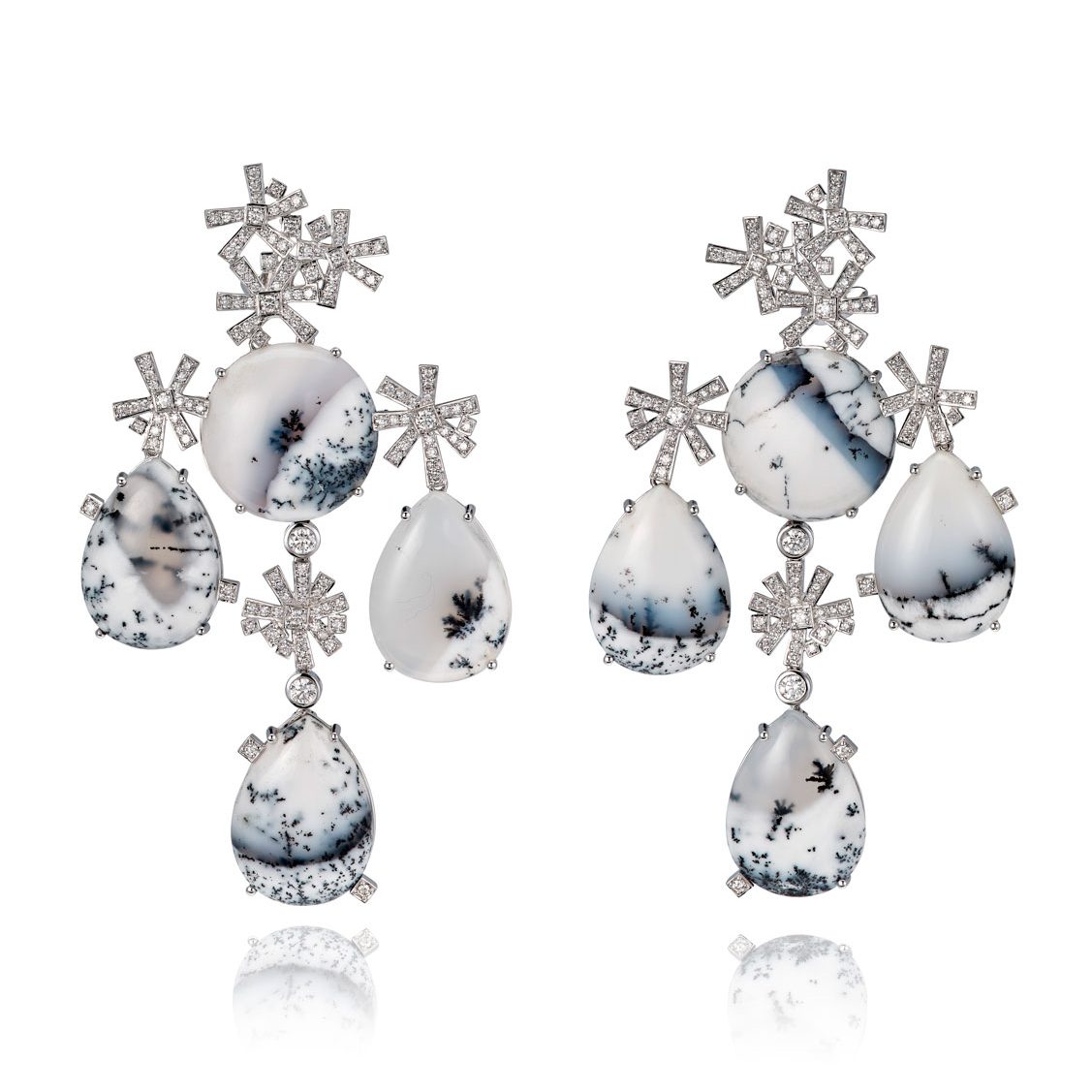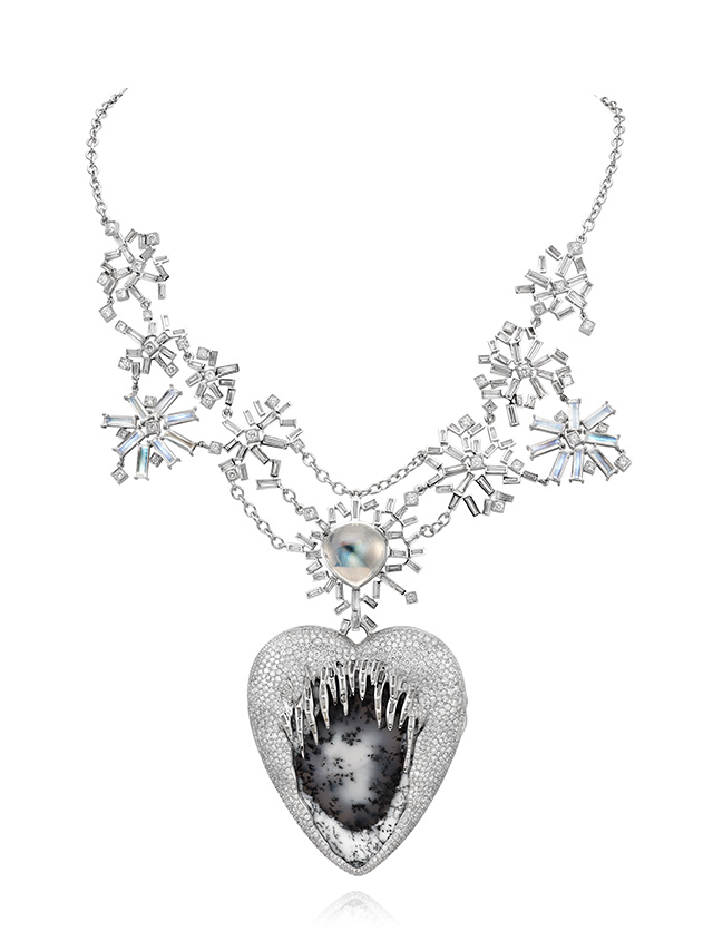 Dans ces opales, des filaments sombres dessinent des horizons incertains, comme si la glace avait conservé la mémoire d’anciennes forêts. L’imaginaire s’y engouffre : étendues du Grand Nord, nuits silencieuses, lumières mouvantes. Pour traduire ce froid lumineux, la créatrice convoque des pierres de lune taillées en baguette, aux reflets bleutés presque électriques, et des diamants disséminés comme une chute de neige suspendue.