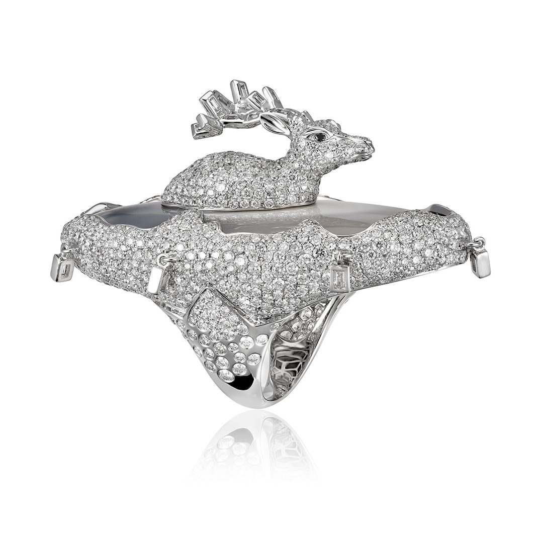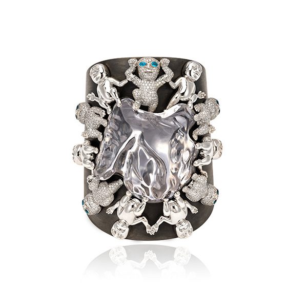 Plus loin, la collection s’anime. Une faune silencieuse surgit : créatures adaptées à l’effacement, silhouettes fondues dans le blanc. Ailleurs, la tension affleure dans des tourmalines bicolores, où se lit la rudesse d’un territoire où survivre impose la lutte. Une baleine sertie de diamants gris fend une mer d’opale, scène à la fois calme et traversée d’une énergie sourde.