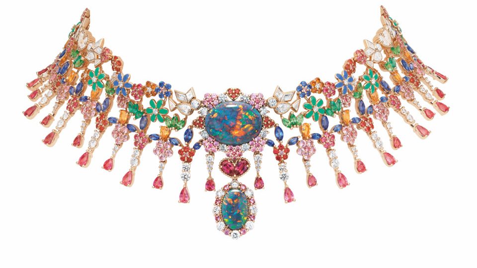 Au cœur de cet univers, Soleil Céleste déploie une symbolique astrale. Inspirée par l’intérêt de Christian Dior pour les arts divinatoires, la parure associe diamants jaunes, étoiles, lunes et opales noires en doublets sur turquoise. Le bijou se fait modulable : bracelet transformable en ras-de-cou, broche pensée aussi comme ornement de cheveux. Une approche fluide, fidèle à l’idée d’un bijou vivant.
