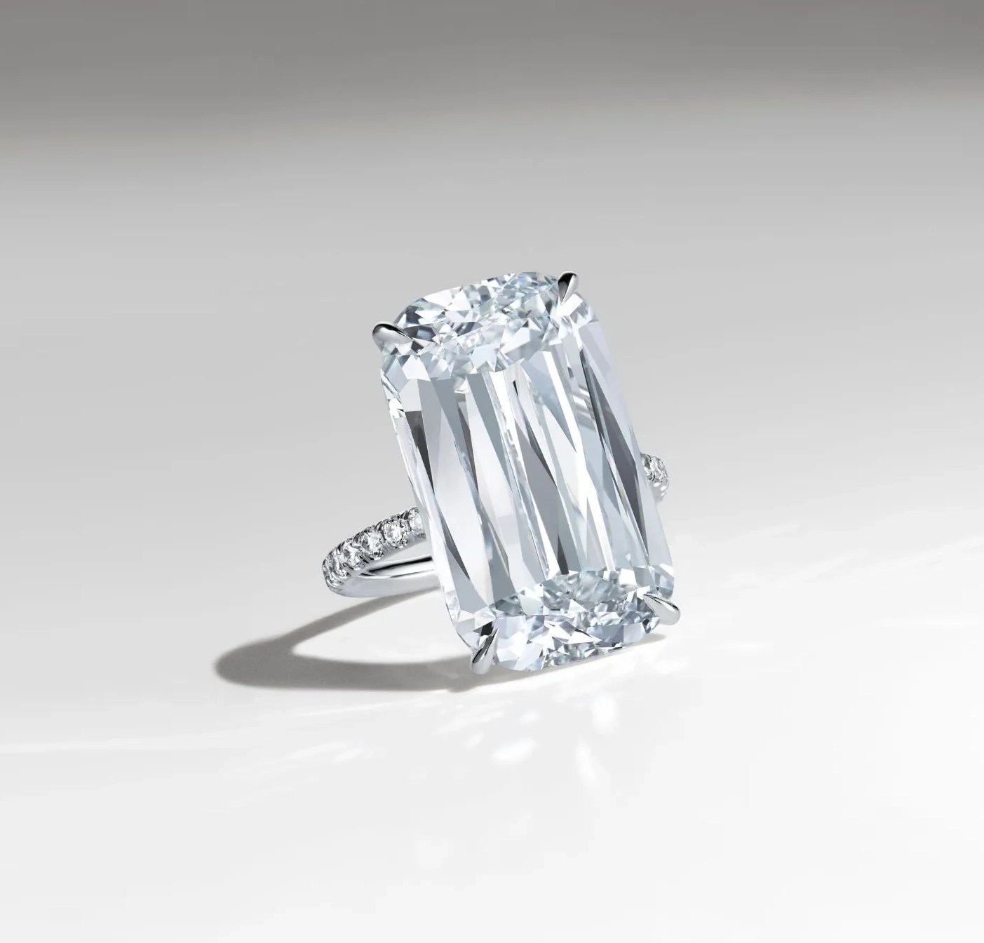 The result is unlike anything else. Its rectangular shape with softly rounded corners and a perfectly symmetrical silhouette evokes the serenity and strength of its namesake. Visually, the cut appears up to 30% larger than an emerald-cut diamond of the same carat weight, a feat achieved through its unique faceting and proportion.