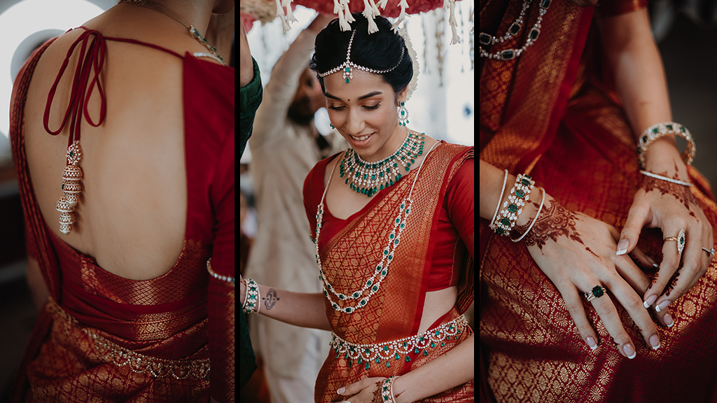 “As a jeweller, there was pressure to make a statement, but I wanted to feel like myself without imitating anyone else’s style. I looked inward for inspiration, chose tried-and-tested combinations like real diamonds and emeralds, and designed unique pieces for each occasion. For the wedding ceremony, I was very particular about a unique oddiyanam (hip belt), which I created in diamonds and emeralds instead of traditional gold sheetwork. For the cocktail, I opted for a modern take on a haathphool, skipping the necklace and embellishing my gown’s strap with natural diamonds and rubies. And for the pre-wedding party, I chose diamond and tanzanite drop earrings for a playful, unexpected splash of colour.”